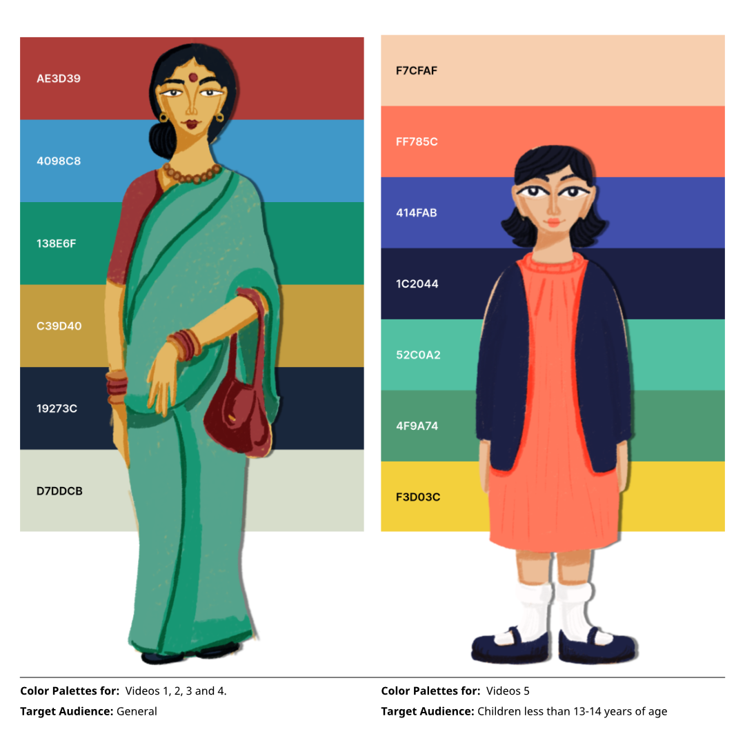 A color palette true to Jaimini Roy's art was chosen for the 4 videos. Whereas a brighter color pallete was chosen for the children's video which was the 5th one.